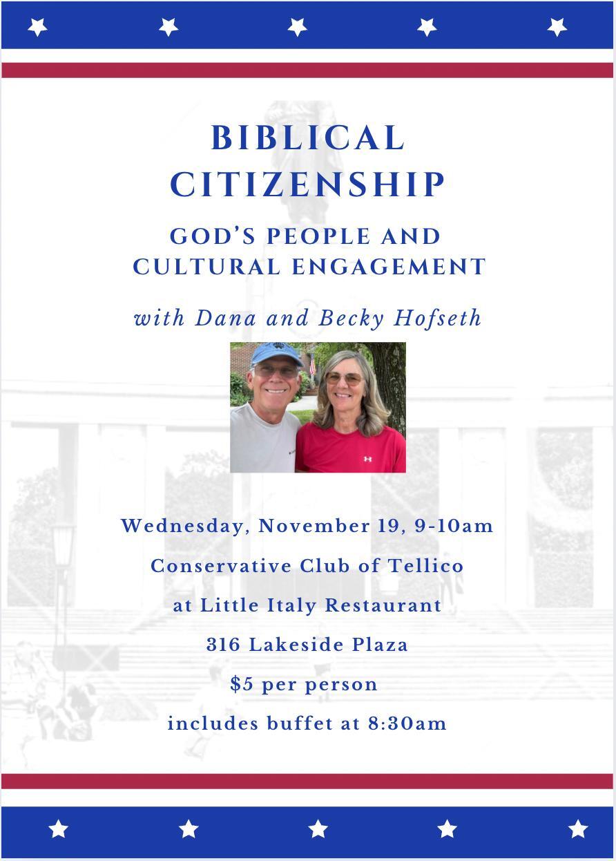 November 19th @ 8:30am – Little Italy Restaurant, 316 Lakeside Plaza, Loudon. Biblical Citizenship presentation.
