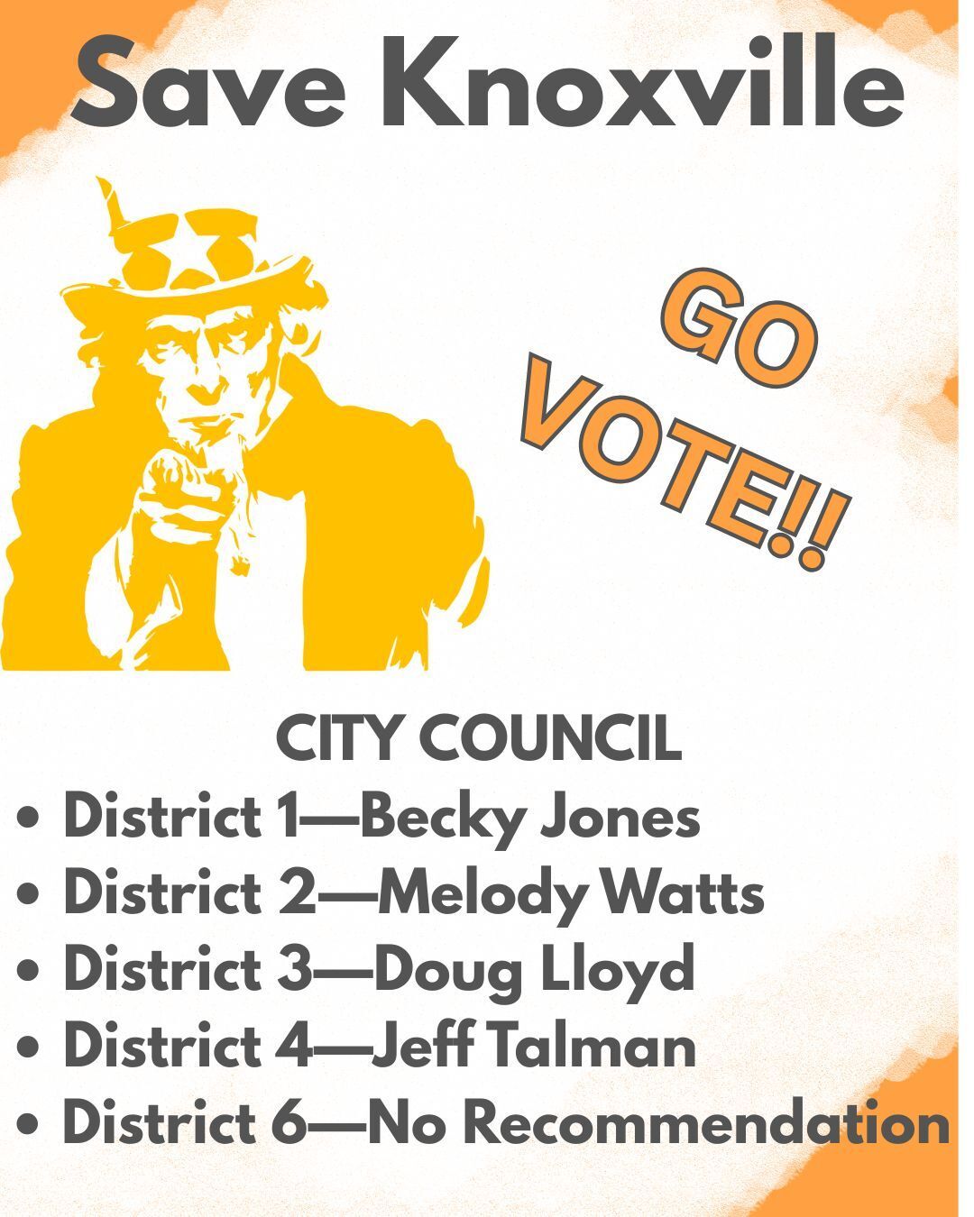 Well, friends, we have one last day to vote to elect conservatives on the Knoxville City Council and PREVENT increased taxes. Election Day is November 4th. If you live in the city limits and have not yet voted, please set your reminder to vote on Tuesday! Then, contact all of your like-minded friends and family who live in the city and tell them to set their reminders as well. Please follow up with them on election day to make sure they vote. This is our best chance to change the makeup of the city council and save our city. Vote Conservative. Vote AGAINST increased taxes. VOTE!!