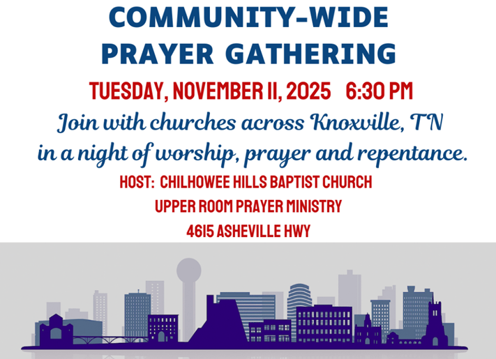 Everyone is invited to join us for a time of prayer and repentance on November 11th at 6:30pm at Chilhowee Hills Baptist Church. Please help share the information with your church, friends, and family.