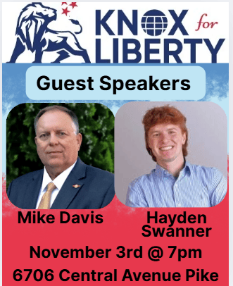Our next meeting is Monday November 3rd @ 7pm at 6706 Central Avenue Pike. Doors open at 6:30pm to socialize with old friends and make some new ones. We will host 3 speakers this month! Mike Davis, candidate for Knox County Sheriff, will be joining us to discuss his campaign and answer questions. And, TPUSA East TN Representative Hayden Swanner and TPUSA UTK Chapter President Emma Arns will update us on their growth in our area and how we can help. Bring some friends and join us!
